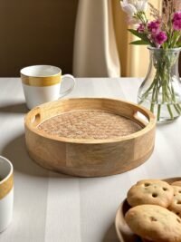 Lividora® Handcrafted Cane-Inlay Wooden Round Serving Tray | 12-Inch Mango Wood Tray in Natural Wood Finish – Elegant Tea, Coffee & Snack Server, Decorative Centerpiece for Home