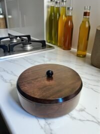 "- Premium Mango Wood – Handcrafted from seasoned mango wood with a polished finish, offering durability and a rich natural grain - Natural Heat Retention – Dense wood construction keeps rotis, chapatis, and tortillas warm and fresh for longer - Secure Wooden Lid with Knob – Ergonomic lid ensures freshness while providing an easy grip for serving - Multi-Purpose Storage – Ideal for rotis, parathas, tortillas, bread, or as a serving bowl for snacks and dry foods