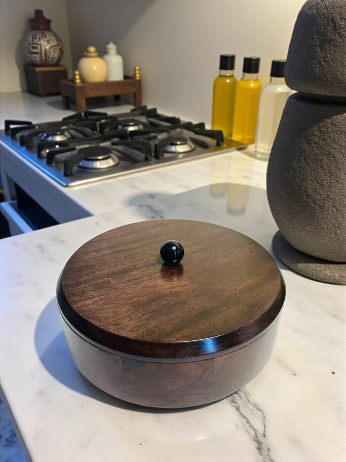 LividoraĀ® Handcrafted Wooden Circular Roti Box | Premium Chapati & Bread Storage Container with Natural Heat Insulation ā Elegant Mango Wood Roti Dabba with Lid & Knob