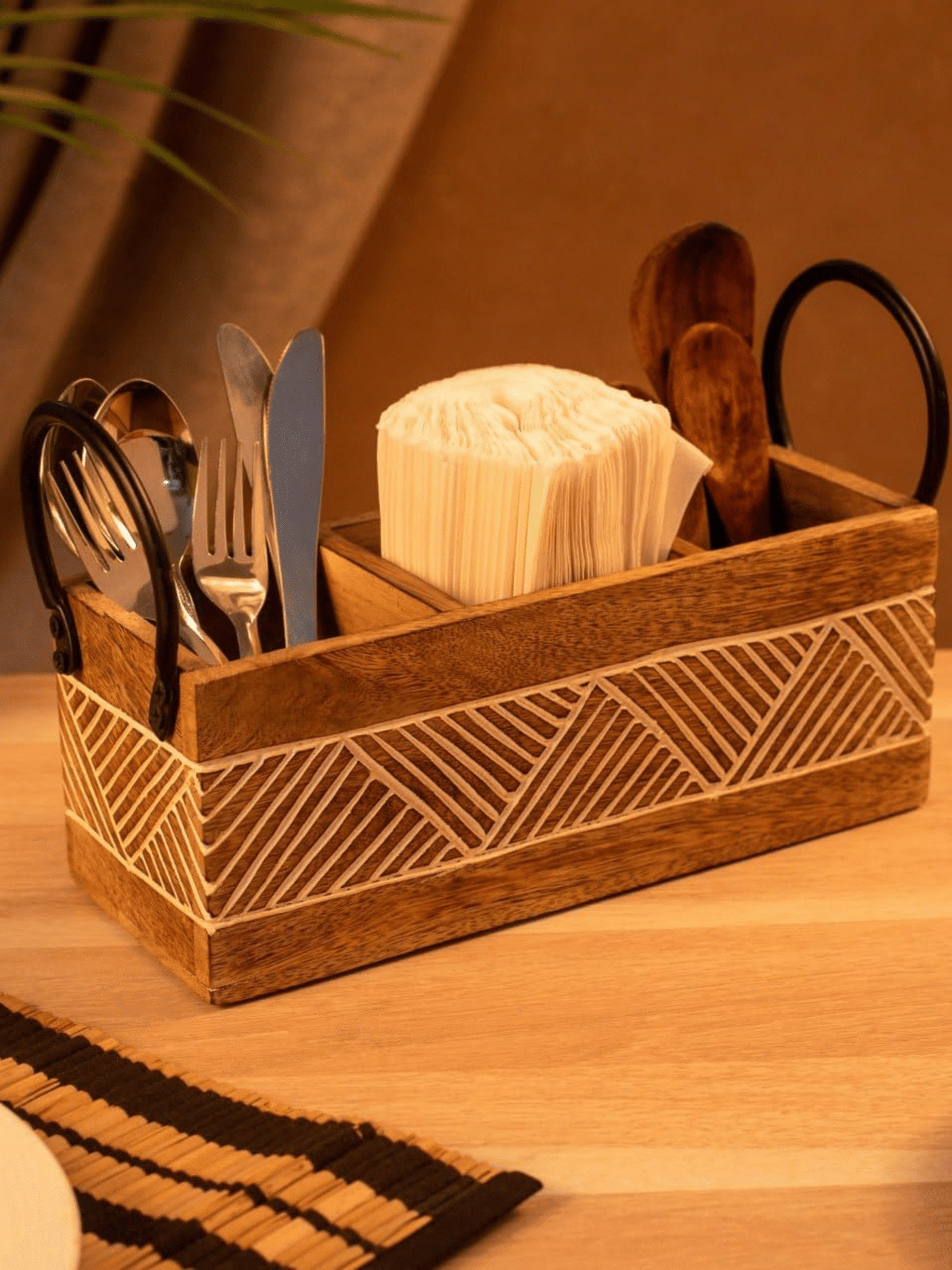 Elevate your home organization with the Lividora® Cube 3-Compartment Wooden Organizer, a blend of artisan craftsmanship and modern functionality. Handcrafted from seasoned mango wood, it features intricate hand-carved geometric patterns that bring a touch of elegance to any setting. With three spacious compartments, this versatile organizer works beautifully as a cutlery holder for your dining table, a pen stand or desk organizer for your study, a remote holder for your living room, or a tea & coffee station caddy. The sleek black metal handles add a modern contrast and ensure durability with easy portability. Eco-friendly, durable, and stylish, the Lividora® Cube Wooden Organizer is a thoughtful choice for gifting and a timeless addition to your home.