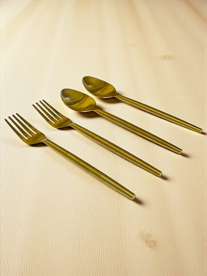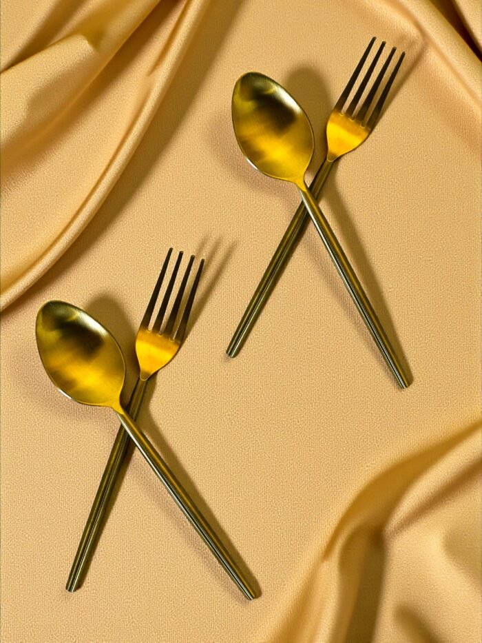 Elevate your dining table with the LividoraĀ® Gold Finish Cutlery Set of 4, a luxurious collection designed to bring sophistication and comfort to every meal. Finished in a stunning matte gold tone, these handcrafted spoons and forks are more than just tableware ā theyāre a statement of timeless elegance. Each piece is substantially weighted and perfectly balanced, giving you a premium hand-feel that sets them apart from ordinary lightweight cutlery. Designed for both everyday meals and festive occasions, these cutlery sets add richness and refinement to any dining setup. Scratch-resistant, durable, and food-safe, the LividoraĀ® Gold Finish Cutlery retains its shine and charm over time, making it an ideal addition to your tableware or a thoughtful gift for special occasions